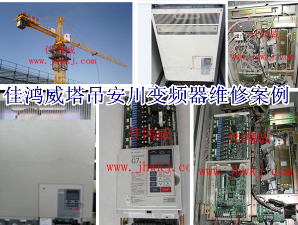 故障分析:塔吊控制柜分别有起升系统,回转系统,变幅系统。在操作室内柜内有两台安川变频器,分别是给变幅及回转电机驱动用的,另有PLC可编程控制器一块,直流低压控制模块两块。中间继电器若干。配电柜在后平衡臂上。内装变频器一台,是给卷扬驱动用的。还有涡流控制模块一个。各类接触器若干。运作原理就是联动台控制信号送入PLC,由PLC输出信号给变频器,变频器再驱动电机带动减速机工作。经过检查为塔吊控制柜一台安川G7-55KW变频器 有短路导致。客户把变频器拆下抬到我司检查,在静态测量发现模块W相和N相有短路。单独拆下控制主板测量没发现问题。上电显示正常,在取消保护测量驱动发 现W相驱动异常更换驱动光耦和稳压二极管、电容后测量正常。在测量模块有W相上下两个模块短路。更换后通电一切正常。发现此问题为W相短路引起。后跟使用 者了解才知道为制动单元短路引起变频器发出响声后通电跳闸。